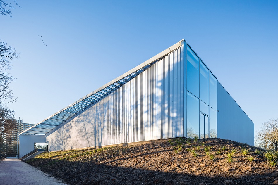 De sporthal van Korfbal Vereniging Wageningen is full electric, circulair en volledig demontabel. Het groene talud moet helpen graffiti tegen te gaan. © Lichtstad Architecten, foto door Basephotography