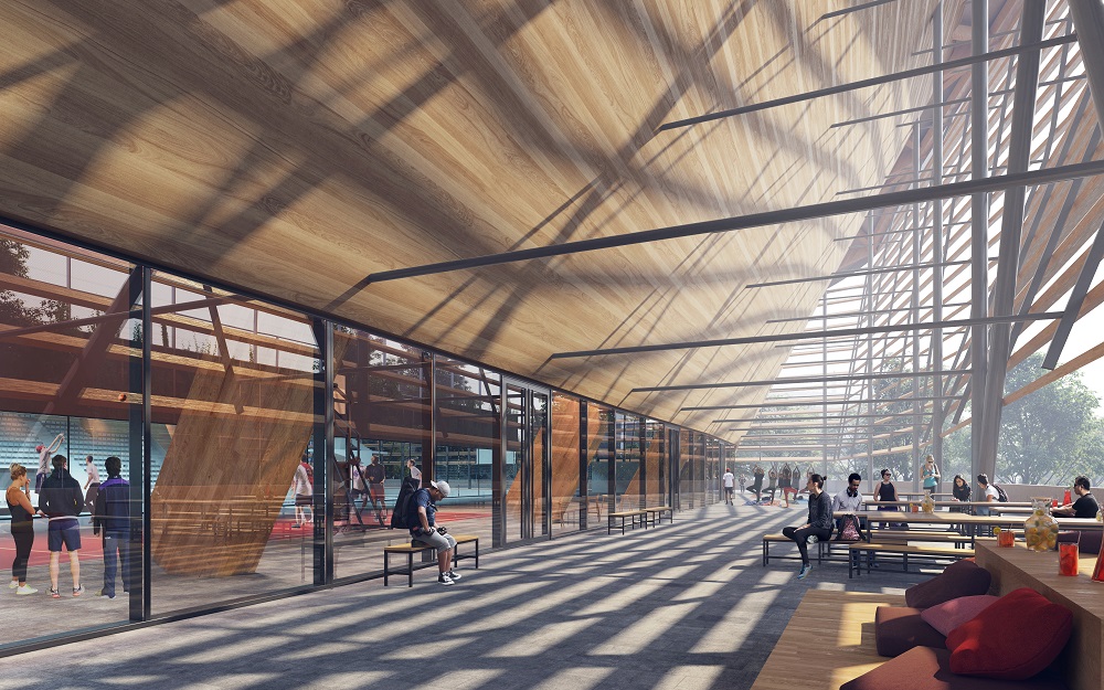 “De slimste oplossing die we voor de verbreding van het type gebruikers bedachten, is dat ongeveer de helft van de tribuneplekken tijdelijk zijn”, zegt Zaal. “Die worden na de Spelen afgebroken, waardoor een enorm vloerveld ontstaat voor bijvoorbeeld padelvelden. En wanneer je tijdens een EK of WK in dit stadion die tribunes weer nodig hebt, kun je ze weer terugbrengen.” Voor al die iteraties is slechts één ontwerp gemaakt. “We noemen dit ontwerpen vanuit de legacy”, zegt Gross, verwijzend naar het feit dat de tweede fase van het pand het uitgangspunt is. “De kunst daarin was om het gebruik van de Olympische functies te vatten binnen het ontwerp van het openbare sportcomplex. Bijvoorbeeld: een lounge voor de Olympische familie is een vereiste, maar in het legacy-ontwerp is daar geen ruimte voor aangewezen, dus heeft die lounge een tijdelijke locatie in de tussenruimte van de overkoepelende houtconstructie.” Het volledige ontwerp was dus een kwestie van omdenken, waardoor een gebouw met een flexibel fundament ontstaat dat ‘wat voor configuratie dan ook’ kan krijgen.