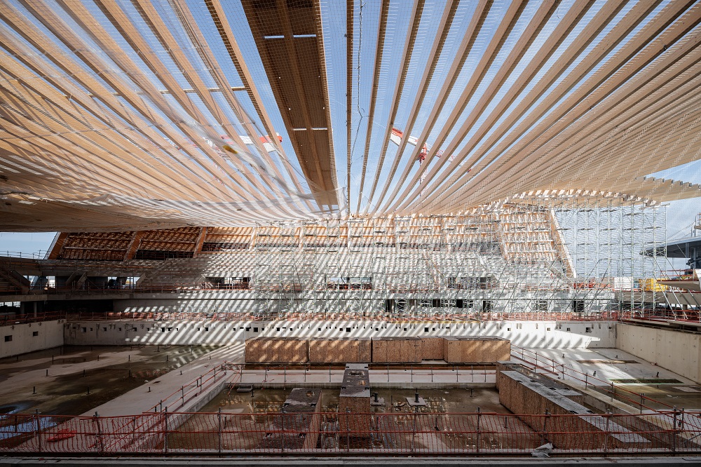 De bouw van het Aquatics Center is gestart, waarbij de volledige houten hoofdconstructie duidelijk zichtbaar is. De oplevering staat gepland voor 2024. Foto door Salem Mostefaoui