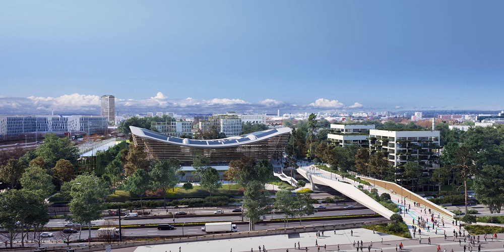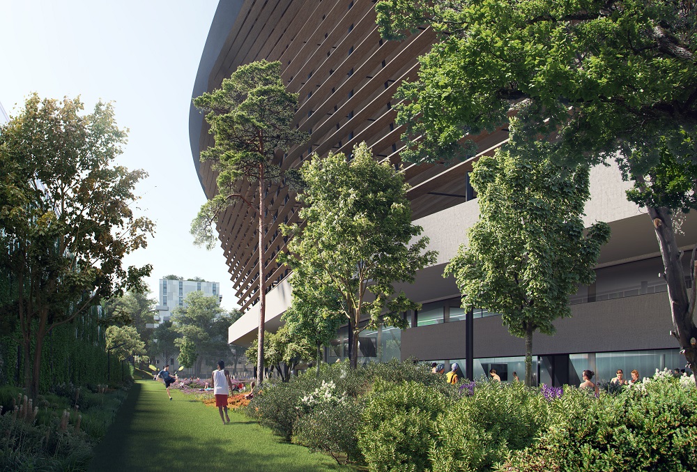 Het Aquatics Center wordt na de Spelen van 2024 een openbaar multifunctioneel sportcomplex dat tevens een groen hart van de buurt moet zijn. © Proloog