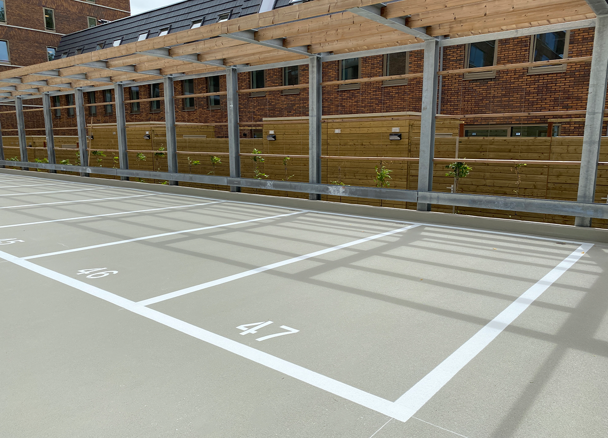 Er is gekozen voor Triflex ProPark 1 op het parkeerdek en Triflex ProPark 3 op de hellingbanen. Deze systemen zijn volkomen naadloos en volledig waterdicht en het beschermt het parkeergebouw tegen de meest extreme weersomstandigheden. Daarnaast is dit systeem bestand tegen de werking en scheurvorming, die optreedt in een constructie bestaande uit kanaalplaten met druklaag als gevolg van thermische en mechanische belasting.