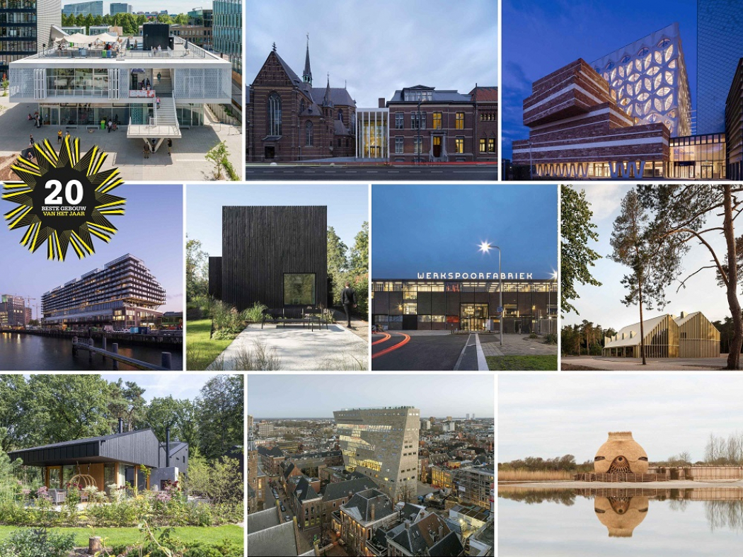 In de categorie Particuliere woonbeleving zijn dat het Tiny Holiday Home aan de Vinkeveense Plassen en het Huis met staart in Soesterberg. Leefbaarheid & sociale cohesie wordt vertegenwoordigd door Forum Groningen, de eigentijdse ‘kerk’ Domusdela in Eindhoven en Fenix 1 in Rotterdam. In de categorie Stimulerende omgevingen zijn de uitbreiding van de Rietveldacademie in Amsterdam en de tot bedrijfsverzamelgebouw verbouwde Werkspoorfabriek in Utrecht genomineerd. En in de categorie Identiteit & icoonwaarde zijn Parkpaviljoen Hoge Veluwe, museum Naturalis in Leiden en het vogelobservatorium Tij bij Stellendam genomineerd.