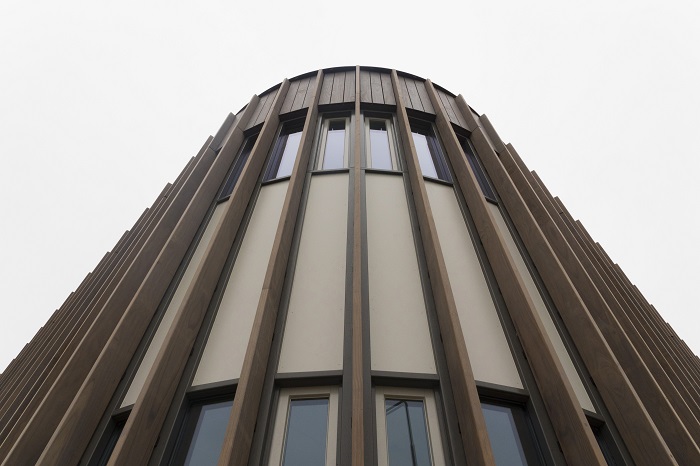 Dit verschil in gebruik komt ook tot uiting in de toegepaste materialen. De ronding van het hoge element is uitgevoerd in hout. Daarbij zijn de delen verticaal geplaatst wat het idee van een baken versterkt. Tevens komt het hout terug in de entree voor een uitnodigend gebaar als ontvangst.