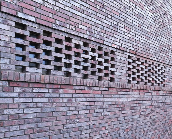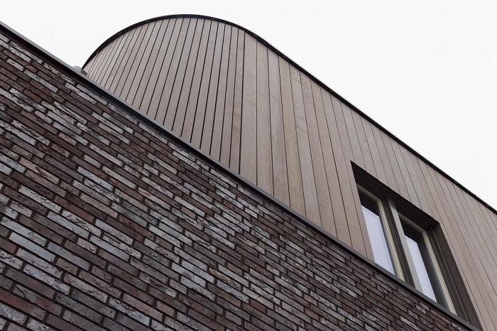 Als contrast met de zachte uitstraling van het hout is voor de twee vleugels gekozen voor robuust metselwerk, waarbij de grijze coating van het hout en de paarsrode kleur van de gevelstenen zorgvuldig op elkaar zijn afgestemd. Hetgeen geleidt heeft tot een evenwichtig en representatief gebouw.