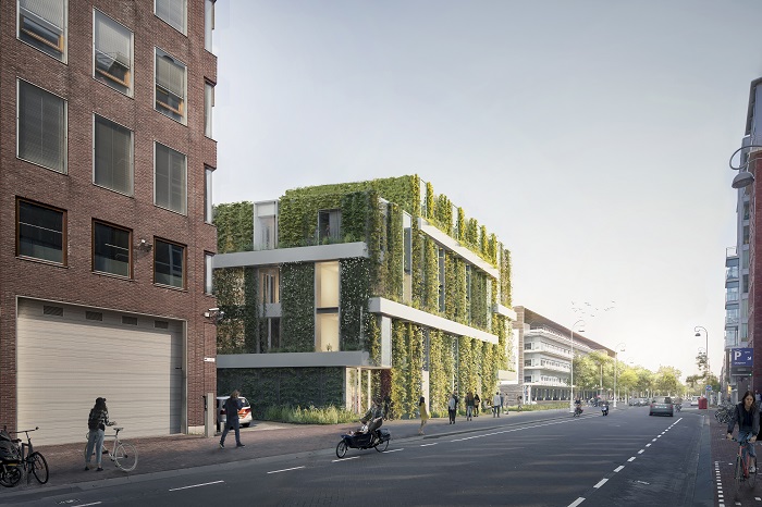 Natuurlijk wordt het water ook opgevangen in de bakken zelf. De beplantingsoorten zijn geselecteerd op geveloriëntatie en nectar- en bessenrijkdom. De begroeide gevels zijn nest- en schuilplekken voor zangvogels en insecten. Het dak is een combinatie van ruigtekruiden en zonnepanelen. “De beplanting groeit vanaf straatniveau omhoog en hult straks de gehele envelop in het groen, en zorgt voor de opvang van fijnstof en CO2, produceert zuurstof, filtert zonlicht en reduceert geluid.”