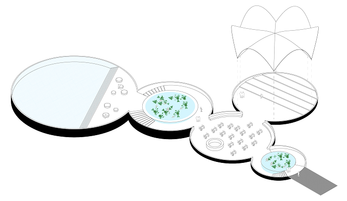 Het complex verbindt beide steden door een gezamenlijke, groene toegangsweg. Vanaf dit pad lopen bezoekers direct de lagune in, waar een drijvend plein wordt gerealiseerd dat half onderwater ligt. Het plein blijft drijvende door responsieve luchtkamers, dezelfde die worden gebruikt in onderzeeërs, zodat op basis van het aantal bezoekers van het plein water wordt opgenomen of wordt afgestaan. Op het plein worden diverse faciliteiten gerealiseerd: een organisch restaurant, een zwembad, een auditorium en een waterplein.