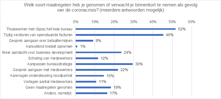 Direct na het afkondigen van de maatregelen zijn veel bureaus thuis gaan werken en komen nu weer gedeeltelijk terug naar het bureau. Het thuiswerken is in de meeste gevallen technisch goed verlopen. De productiviteit is gemiddeld licht gedaald, maar het ziekteverzuim is opmerkelijk laag. Andere veel voorkomende maatregelen die bureaus hebben genomen zijn het versturen van openstaande facturen, het aanpassen van de bureaustrategie, extra aandacht voor bestaande opdrachtgevers, meer business development en in gesprek gaan bestaande opdrachtgevers en met de medewerkers. Er zijn nog wel bureaus die mensen aannemen, maar de meeste geven aan het aannemen van nieuw personeel uit te stellen, tijdelijke contracten niet te verlengen of te kiezen voor samenwerking met zzp’ers.