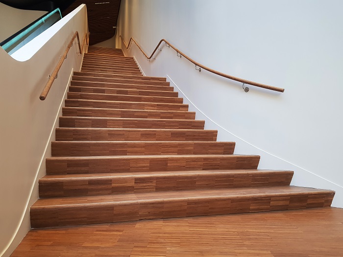 Bamboe vloeren en plafonds vormen met witte, glad afgewerkte wanden de basis van het interieur. Het contrast van wit met het natuurlijke bamboe versterkt het dynamische gevoel dat de architectuur opwekt. Grote afgeronde bamboe pilaren vormen de eyecatchers: hier loopt het bamboe door van de vloer tot in het plafond. Met gevoel voor detail zijn de bamboe platen verwerkt tot kolommen die bijna naadloos doorlopen in de plafondbalken. Dankzij de welvingen in het plafond ontstaat de impressie dat het gebouw in beweging is. In de centrale ruimte zijn ook de balies van het informatiecentrum en een bar uitgevoerd in MOSO bamboe.