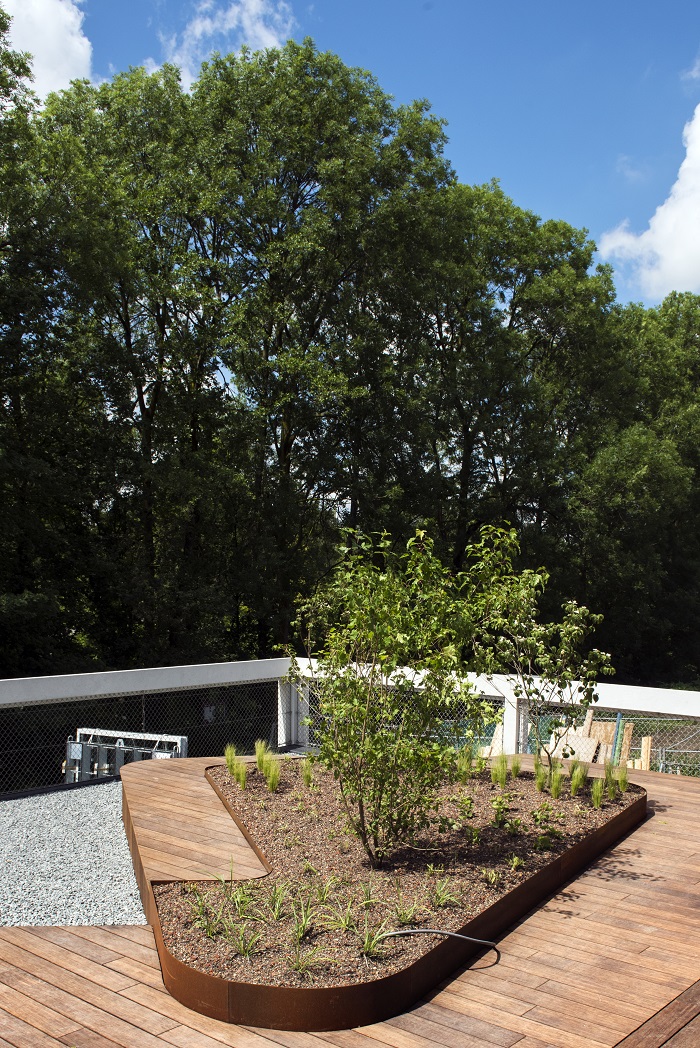 Om de maximale draagcapaciteit niet te overschrijden, is in de plantvakken onder de beplanting een lichtgewicht opvulling gebruikt. De beplanting is vervolgens afgestemd op de beschikbare substraatdiktes, zodat de planten zich in natuurgetrouwe omstandigheden kunnen ontwikkelen. Voor de bewatering is in het plantvak een wateraansluiting met druppelslangen aangelegd. Om het hoogteverschil in het dak op te vangen, kreeg de beplanting een slingerende omlijsting van cortenstaal.