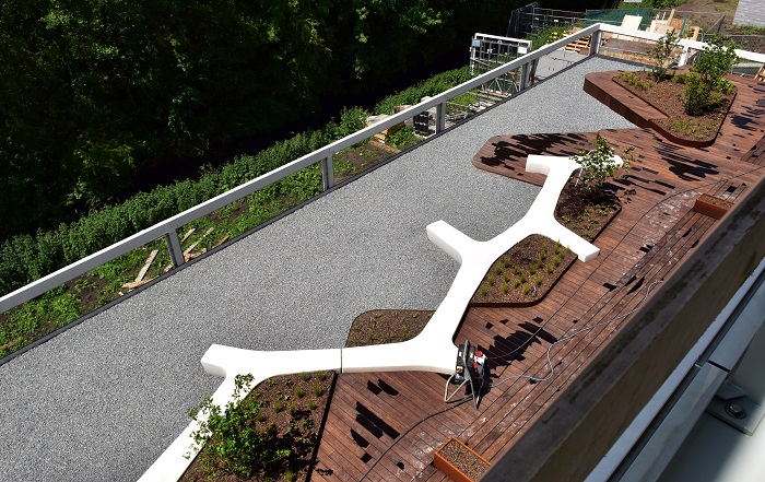 De gezamenlijke daktuin, die half juni opgeleverd is, kreeg een aantal bijzonder blikvangers, zoals de grote Twig zitelementen van Samson Urban Elements. De zitelementen bieden aan beide kanten zitplaatsen. Vanwege het gewicht van de betonnen elementen is samen met de bouwkundig constructeur kritisch gekeken naar de gewichtsverdeling en de toelaatbare dakbelasting.
