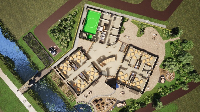 De natuurlijke principes – Bruggink spreekt van biofilische principes – zijn door de architect op alle niveaus vertaald in gebouw en ruimtelijke context. Een vegetatiedak vormt de natuurlijke beëindiging van de clusters – op de hoogste cluster zijn PVT-panelen gemonteerd. Samen met de bomen - die als zonwering fungeren – zorgen de groene daken voor een natuurlijk en aangenaam binnen- en buitenklimaat. Hemelwater loopt via een spuwer het plein op en vindt zijn weg door het natuurlijke speelterrein. Als het regent, willen de kinderen juist naar buiten! Op het dak van het laagste cluster, de onderbouw, is een openluchtlokaal gesitueerd, deels overdekt, en ingebed in een vegetatiedak. Dit lokaal wordt het hele jaar door gebruikt, er is een moestuin en er lopen kippen. In het schoolgebouw zijn beschutte zones afgebakend waar leerlingen en personeel zich terug kunnen trekken. Gedempt licht, gedempte kleuren en tonen, zacht meubilair en een mooi uitzicht creëren ook in deze ruimtes, zoals overal elders in het gebouw, een sfeer van ontspanning die helpt om de concentratie, leersnelheid en prestatieniveaus van de leerlingen te vergroten.