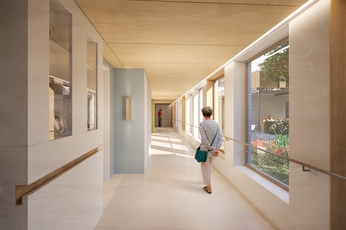 In het interieur is aandacht besteed aan het comfort en de herkenbaarheid voor de cliënten. De ontsluitingsgangen zijn ontworpen als 'kloostergang'. Dat wil zeggen als overdekte omloop met een directe relatie met de omliggende tuinen. Iedere individuele kamer heeft naast de voordeur een vitrinekast gekregen waarin persoonlijke objecten van de bewoner opgesteld kunnen worden. Dit vergroot de herkenbaarheid van de kamer en maakt de gang een stuk levendiger.