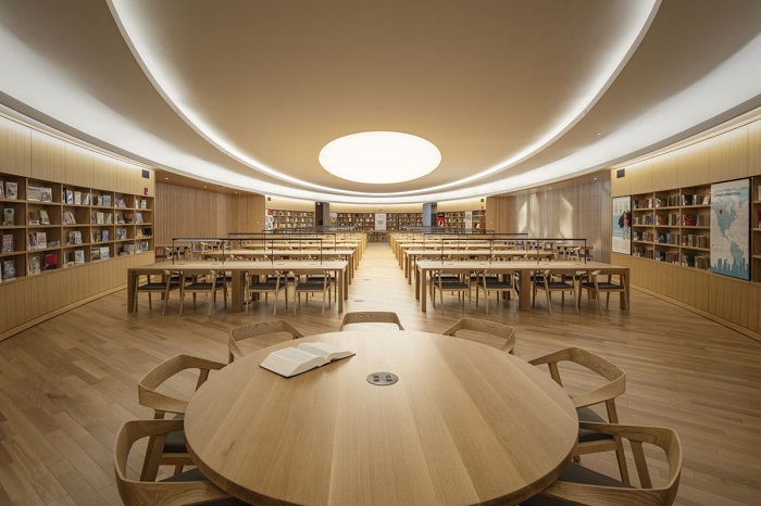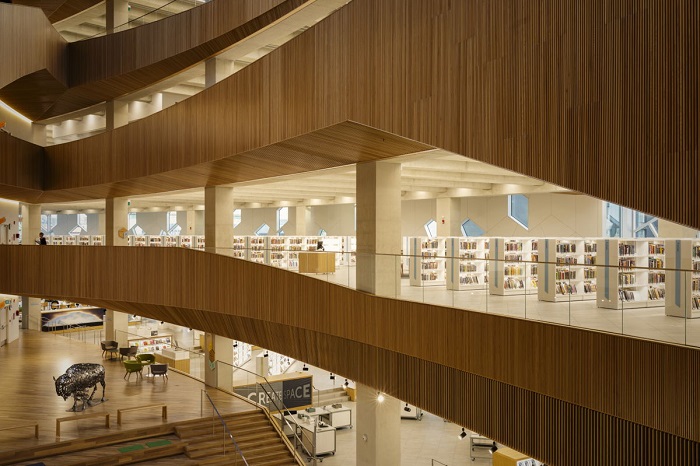 Over de zes verdiepingen die het gebouw telt, zijn verschillende ruimtes verdeeld, zoals verschillende digitale ruimtes en ruimtes waar mensen rustig kunnen lezen. De verschillende ruimtes worden verlicht door natuurlijk licht en de houten lamellen, wat zorgt voor een blik tussen het atrium en de westelijke gevel. Aangekomen bij het noordelijkste puntje van de bibliotheek, bevindt men zich in de Living Room, die uitzicht biedt op de spoorlijn en het ontmoetingspunt van de twee buurten.