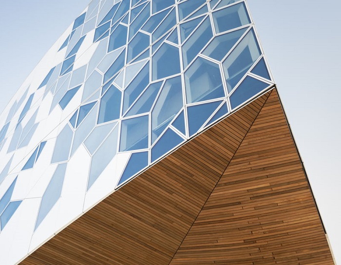 De dynamische drievoudig glazen gevel bestaat uit een modulair, zeshoekig patroon. Geaggregeerde variaties op de zeshoekige vorm verspreiden zich over het gebogen oppervlak van het gebouw in afwisselende panelen van glas en aluminium. Uit deze vormen komen vertrouwde vormen naar voren. Delen van het patroon kunnen lijken op een open boek, sneeuwvlokachtig lijnenwerk, of in elkaar grijpende huizen. Het voornaamste is dat het hele bouwvolume is ingesloten in hetzelfde patroon, waardoor alle zijden van het gebouw als 'voorkant' kunnen functioneren.