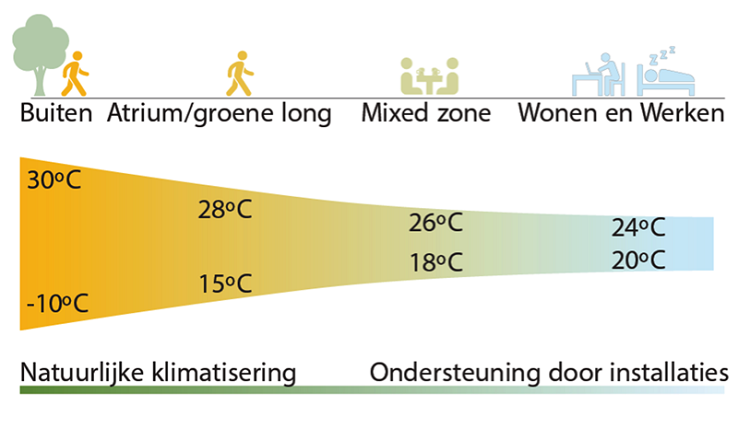 De huidige gevel is een harde scheiding tussen binnen en buiten en het binnenklimaat is constant. “Maar een constant binnenklimaat in het hele gebouw is helemaal geen doel op zich,” zegt Wiedenhoff. “Wat we willen is de juiste bandbreedte creëren voor wat mensen in een bepaalde ruimte aan het doen zijn: stilzitten en concentreren, vergaderen, lopen van a naar b. We zijn nu veel tijd en energie kwijt aan het egaliseren van het klimaat, terwijl dat helemaal niet hoeft. Je kunt ook plaatselijk verwarmen of koelen of mensen zelf de plekken laten opzoeken met de juiste temperatuur voor wat ze willen doen. De overgang van natuurlijk naar mechanisch moet veel vloeiender worden en we moeten vaker toelaten dat ruimtes in ons gebouw vrijwel dezelfde temperatuur hebben als buiten.”