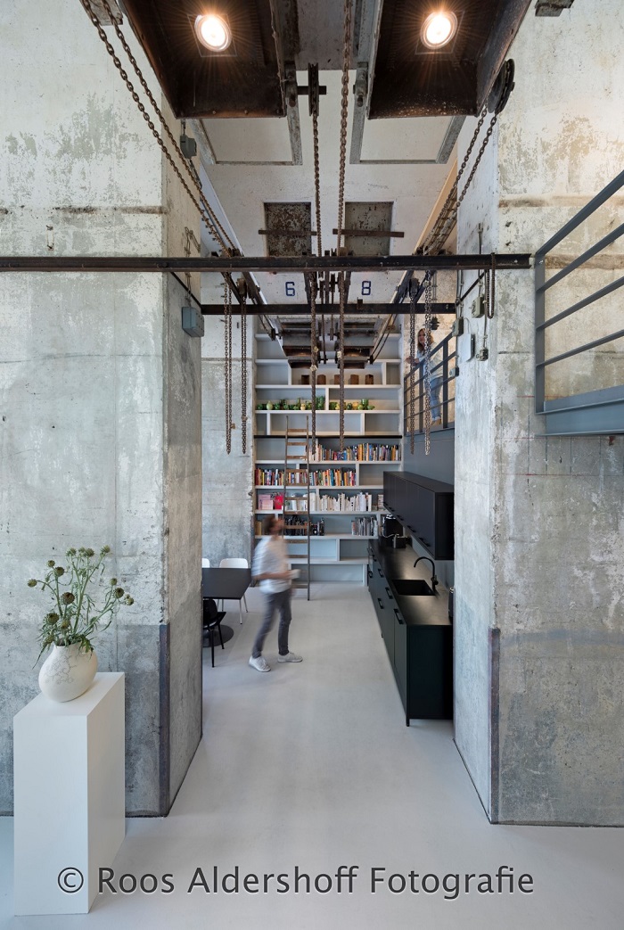 Groen+Schild wilde het ruige karakter van de binnenzijde van de silo bewaren. De trechtermonden, de kettingen, het ruwe beton en de bakstenen wanden zijn dan ook zoveel mogelijk intact gelaten. Wel is een extra verdieping toegevoegd met een uitbouw in staal en glas, die vier meter uitkraagt aan de kant van de haven.