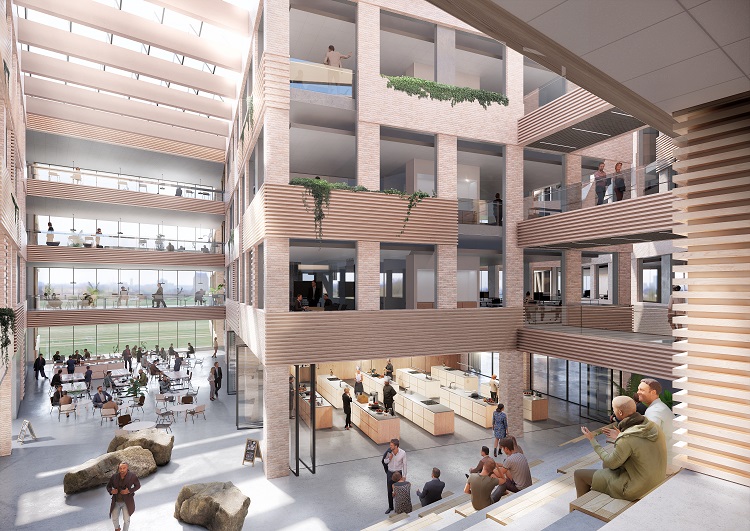 Deze centrale ruimte dient als bruisend hart van het gebouw. Hierin worden gemeenschappelijke voorzieningen als een kantine, showkeuken en winkel voor medewerkers gesitueerd. Ook verbindt de ruimte het gebouw verticaal door middel van open bruggen en trappen. Door de versprongen opstelling van de rechthoekige volumes rond een levendige atriumruimte ontstaat een divers en flexibel ruimtelijk landschap. Duidelijk afgebakende ruimtes voor de afdelingen van de bedrijven in elke vleugel worden gecombineerd met een diverse setting van verschillende ruimtelijke kwaliteiten en werkzones. Dit zijn onder meer privé-vergaderruimtes, eenpersoons- en groepswerkplekken, koffiespots en sociale ontmoetingszones.