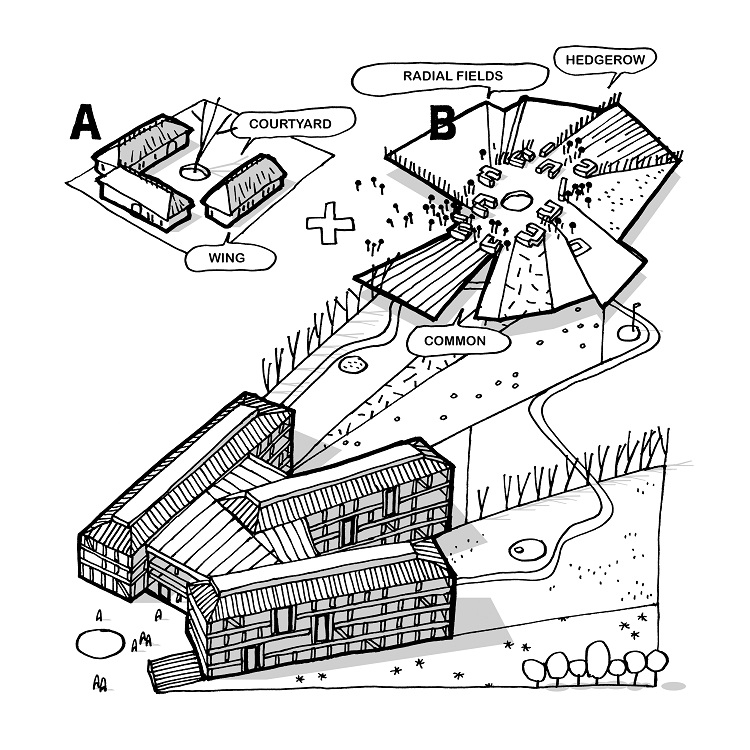Ook creëren de werkomgevingen en het landschapsontwerp gevarieerde reeksen van functionele, sociale en activiteitenzones. Het landschap is gemodelleerd naar de radiale veldverdeling van de historische dorpen en waaiert uit in diverse velden met natuurlijke en agrarische landschappen. Deze velden worden gescheiden door hagen en gebieden voor klimaatadaptatie en regenwaterbeheer, waardoor nieuwe leefgebieden voor flora en fauna ontstaan.