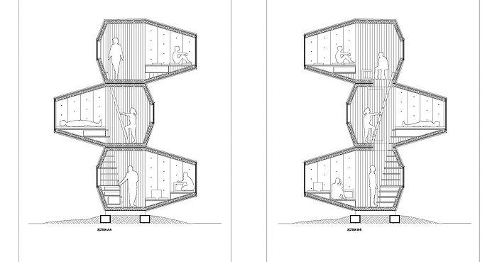 Dit microhuis bestaat uit drie opgestapelde blokken met toelopende zijkanten. Het voordeel van de Living Unit of Cabin is dat de drie blokken – afmetingen: 2,5 bij 4,5 meter en 2,7 meter hoog – gecombineerd kunnen worden. Dat maakt het mogelijk om de tiny house ook op minder vlakke ondergronden te bouwen. Volgens OFIS kan de Living Unit of Cabin ook geplaatst worden op een berg, in de boomtoppen of midden in de natuur. Opgestapeld worden de blokken met elkaar verbonden door grote trappen.