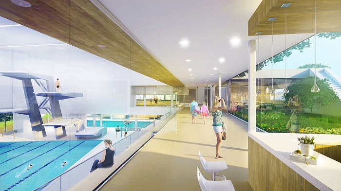 Het zwemgedeelte omvat drie baden, waaronder een 10-baans 50 meter wedstrijdbad en een multifunctioneel bassin met springtorens van drie, vijf, zevenenhalf en tien meter hoog. Ook een spectaculaire glijbaan van 90 meter ontbreekt niet. Daarboven bevindt zich een grote NOC*NSF sporthal, die ook te gebruiken is voor evenementen. Onder het gebouw is parkeergelegenheid voor ruim 200 auto’s. Vanaf alle zijden zijn de verschillende functies in het gebouw via markante gevelopeningen herkenbaar. Eenmaal binnen is het interieur licht en verrassend.