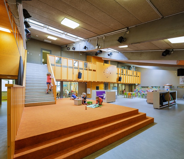 Het hart in het gebouw wordt gevormd door het speellokaal en de BSO-themalokalen. Hieromheen zijn de aula’s van de diverse partners gelegen. Aan deze grote ruimtes zijn vervolgens de groepsruimtes gepositioneerd. Een bovenplein doet dienst als buitenruimte voor de BSO, waardoor de kinderen na schooltijd in een andere omgeving komen dan overdag.