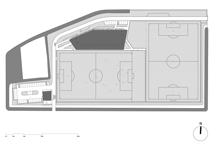 In het gebouw zijn allerlei faciliteiten opgenomen die horen bij een voetbalclub in deze tijd. Een groot deel van het gebouw staat in het teken van sportmedische faciliteiten en afdelingen die zich bezighouden met research en de prestaties van spelers. Dit wordt ondersteund door diverse kantoren, een auditorium, horeca, ontspanningsruimtes en natuurlijk de kleedfaciliteiten met diverse wellness-voorzieningen. Rondom het gebouw worden twee voetbalvelden en een aparte keeperszone aangelegd.