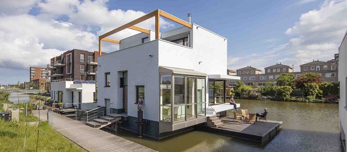 De Float House is gebouwd aan de Glaskloksingel in Delft. Daar is een breed water gerealiseerd, met een oever waaraan zes drijvende woningen zijn gebouwd. De waterwoning Float House is speciaal voor deze locatie ontworpen op basis van het bouwsysteem van de producent. Het is een drijvende woning met het karakter van een vrijstaande villa. Het bouwsysteem gaf de nodige vrijheid om de gevels optimaal op de locatie te oriënteren en het dak te kunnen gebruiken als dakterras.
