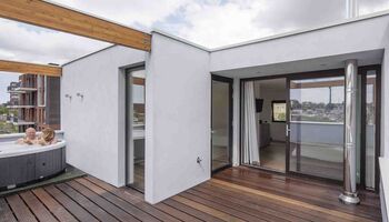 Vanuit de woonkamer is de grote slaapkamer middels een open trap bereikbaar. Deze slaapkamer is direct gelegen aan een zonnig, beschut terras met een jacuzzi. Onder de woonlaag bevinden zich de slaapkamers voor de kinderen met hobbyruimte en berging. Veel aandacht is besteed om de fietsen binnen de woning te kunnen stallen zodat er geen berging op de steiger gemaakt hoefde te worden. De waterstand kan + of -10 cm wijzigen. Daarom zijn de entrees losgehouden van het gebouw. Een drijvend terras is toegevoegd aan het hoofdvolume, bereikbaar vanuit de woonkamer en de keuken.
