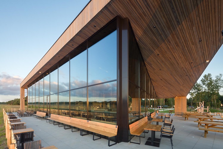In het ontwerp is rekening gehouden met de loop van de zon. Het lessenaarsdak is hellend richting het zuiden met overstekken aan de zuid- en westzijde. De overstekken zorgen voor een aangenaam binnenklimaat door beschaduwing op het terras en zorgen voor beschutting voor de gasten. Hoge glazen puien zorgen voor voldoende daglichttoetreding en verbinden de binnenruimte met de omliggende terrassen en speeltuinen. De noordzijde is maximaal geopend richting het vliegveld met een glazen pui van twee verdiepingen hoog, wat een weids uitzicht over het natuurgebied creëert.