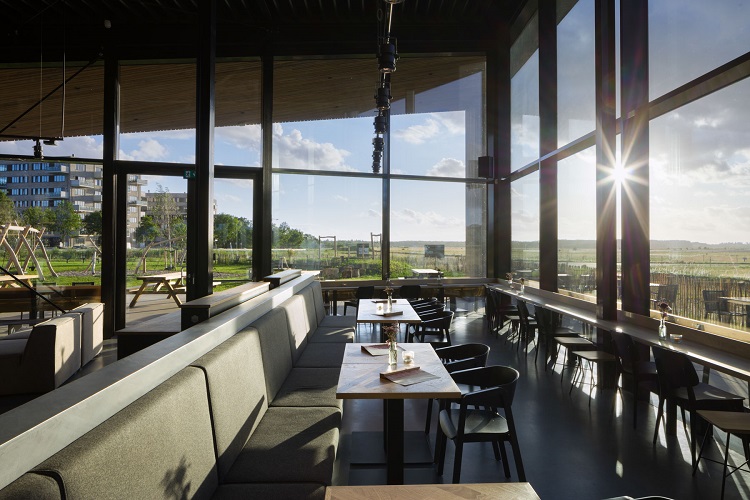 Andere ruimtes in het paviljoen, zoals de multifunctionele ruimte op de extra verdieping en vanachter de bar, is het pand zo ingericht dat telkens een ruim uitzicht word gewaarborgd. De keuken en de toiletten liggen aan de oostzijde. De gesloten gevels aan deze zijde voorkomen opwarming van het paviljoen door de ochtendzon. Deze gevels zijn voorzien van verduurzaamd hout die naar binnen doorloopt. Aan de binnenkant zorgt het hout voor een warme sfeer en een goede akoestiek, terwijl de stalen constructie, het glas en stalen dak voor een industriële uitstraling zorgen.