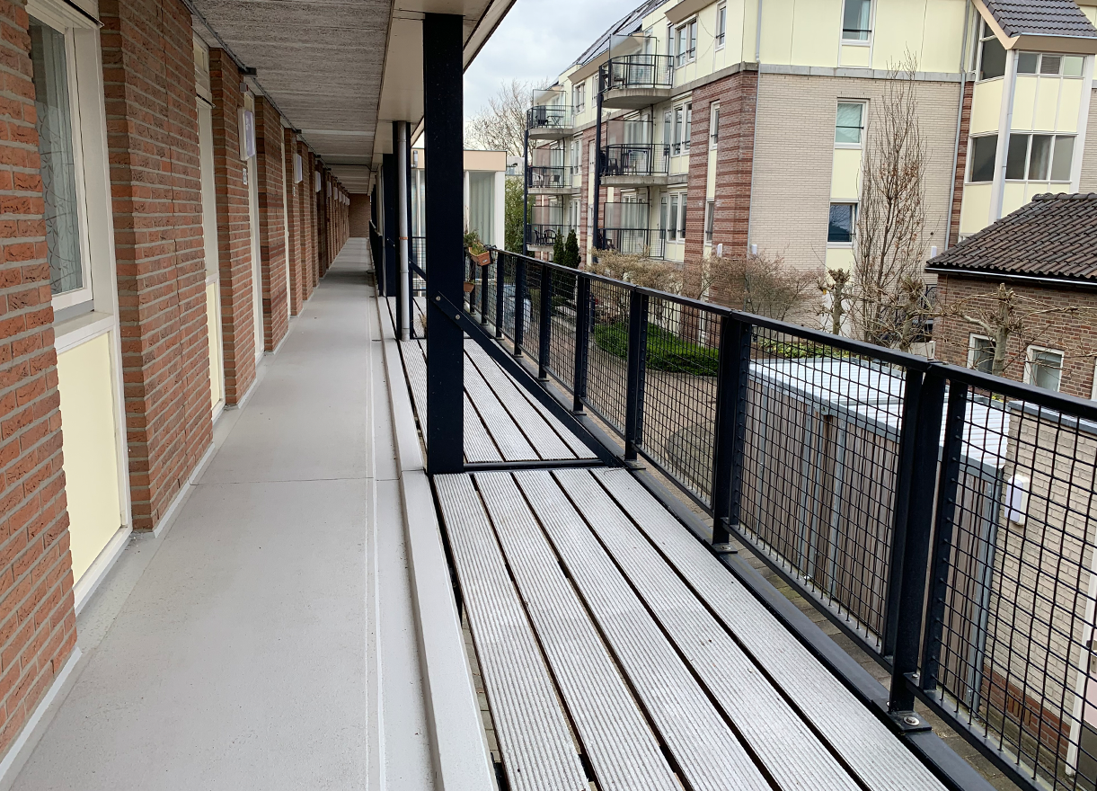 Zowel de opdrachtgever als de bewoners wensten een duurzame en goed te onderhouden vloerafwerking met voldoende stroefheid. Sealteq nam het project voor zijn rekening. Voor de galerijvloeren is er gekozen voor een hoogwaardig, ijzersterk en esthetisch membraan dat eigenschappen als waterresistent, scheuroverbruggend en naadloos in huis heeft. Aan een deel van de galerij is ook een houten vlonderdeel bevestigd, dat door verwering zeer glad en ontoegankelijk was geworden voor de mindervalide bewoners.