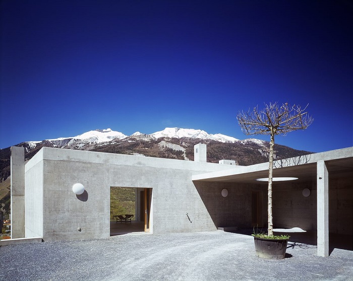 Architect en ingenieur Patrick Gartmannontwierp zijn eigen woning in een minimalistisch idioom. In samenwerking met twee fabrikanten ontwikkelde hij eenisolerende betonsoort die alseenlaagse constructie is toegepast. In plaats van granulaat is leem verwerkt, zand is vervangen doorglaskorrels.