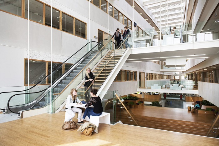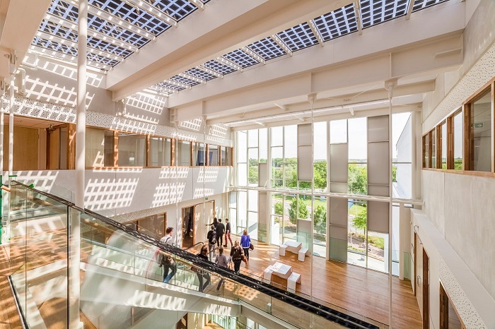 De frisse lucht in het gebouw komt van de gebalanceerde ventilatie met warmteterugwinning. De nagenoeg vrije doorgang van daglicht diep het gebouw in, via grote ramen en het atrium, verhogen het comfort en maken het interieur tot een fijne plek om te werken en studeren. Dat wordt nog versterkt door het vele groen op en aan de getrapte gevels en rondom het gebouw.