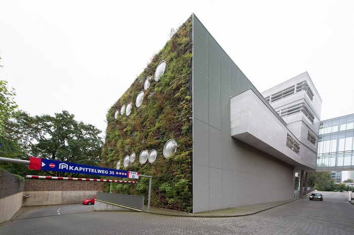 Voor het beoogde groene effect is gebruik gemaakt van Gerolsteiner waterflessen. De betonpanelen zijn onzichtbaar gemonteerd op een railconstructie tegen het houtskeletbouw binnenblad. Bögl geeft aan zeer tevreden te zijn met het resultaat: “Het is altijd spannend om te zien hoever je kunt gaan met je experimenteerlust. Het kost heel veel energie. Maar in Nijmegen heeft zich dat dubbel en dwars uitbetaald.”