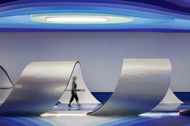 “We wilden het gevoel creëren alsof je door de lucht vliegt, net als wanneer je uit het raam van een vliegtuig kijkt,” aldus Alberto Puchetti van Arboit. Het interieur lijkt haast uit één deel te staan door de naadloze, afgeronde hoeken. Het geheel wordt verlicht door Ledlampen in vloer en plafond.