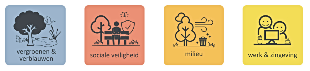 De scan bestaat uit acht hoofdthema’s (zie onder): de acht bouwstenen voor een gezonde en veilige leefomgeving. Daarbinnen hangen tientallen indicatoren die de leefomgeving meetbaar maken. “We maken het zo concreet mogelijk”, zegt Maas. “Heel veel thema’s kun je toetsen. Staat het in het plan? Hoe is het uitgewerkt? Is het logisch verdeeld over de wijk? Is het voldoende en wat is de kwaliteit? Past het bij de omgeving?”