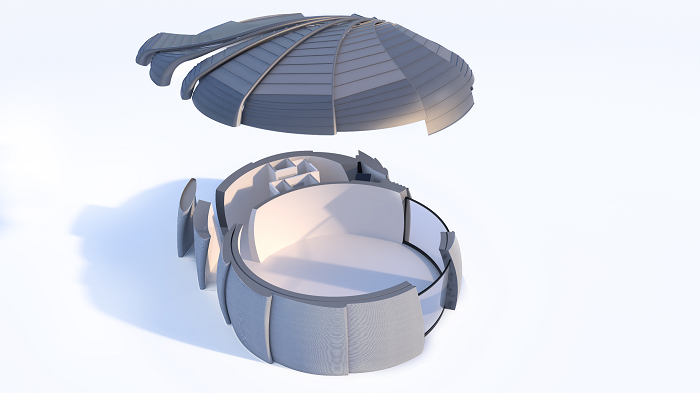 Het gebouw is gelegen naast de entree van vliegveld Teuge. Dit vliegveld heeft een lange historie dat daarmee zijn stempel drukt op de omgeving. Het gebouw markeert de hoek en opent zich langzaam naar de ingang en naar het uitzicht over de velden aan de andere kant van de weg. Deze aaneenschakeling van open en dicht, met een cirkelvormige ruimte als basis, heeft geleid tot een gebouw dat zich manifesteert als de bladen van een turbine. De bladen draaien en openen hiermee doorzichten of sluiten ze. Hierdoor is het gebouw vanuit iedere hoek anders. Een dergelijke vorm is met traditionele bouwmethoden niet of nauwelijks te bouwen. Dat heeft geleid tot een ontwerp waarin de gekromde wanden 3D-geprint worden in beton.