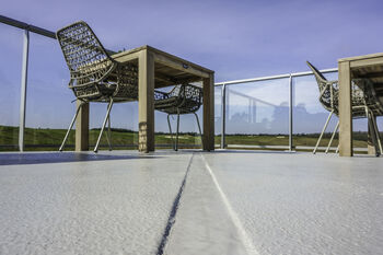 De afwerking moest een beloopbaar waterdicht oppervlak vormen met een beperkt gewicht én met een beperkte hoogte. De keuze viel daarom op het Triflex BIS systeem en het Triflex BTS-P systeem, kwartszand fijn. “Met het Triflex BTS-P systeem, kwartszand fijn konden we een beloopbaar oppervlak realiseren dat gelijk de waterkering vormt”, vertelt Bastiaan van Esseveld, rayonmanager bij Triflex. Het Triflex BIS systeem is een lichtgewicht, gesloten systeem waarbij – in tegenstelling tot bij tegels – geen vuil kan ophopen onder het oppervlak. Deze oplossing was ook geschikt, omdat de onderliggende constructie hierbij waterpas kon worden gelegd: het afschot kan namelijk in de isolatie worden aangebracht. De applicatie van dit systeem is koud en vloeibaar, waardoor het vormvrij aangebracht kan worden, zonder brandgevaar. Details zijn volledig te integreren en door de korrelgrootte is dit systeem antislip en dus makkelijk beloopbaar.