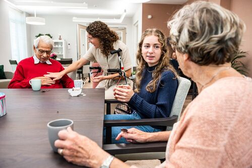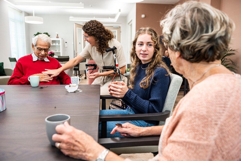 Hoe dan ook, onze jongeren leveren echt veel toegevoegde waarde. Dat zie je vooral in de interactie tussen de twee groepen. Jongeren vinden het leuk om te luisteren naar de verhalen van ouderen toen zij twintig waren. Die onderlinge uitwisseling geeft geweldig veel dynamiek en gesprekstof. Dat is voor beide kanten ontzettend waardevol. En het levert ook eens een ander verhaal op aan tafel. Het gaat niet meer de hele dag over de ziekte van de een en de ander. Er komen echt leuke dingen uit voort en dat moet je ook spontaan laten gebeuren.”