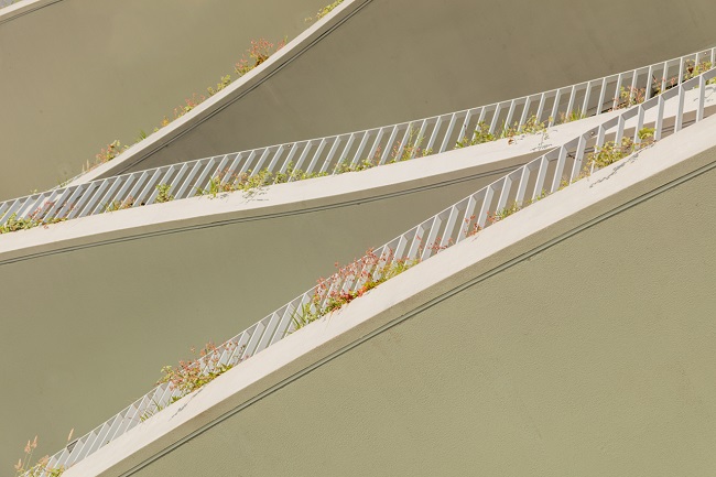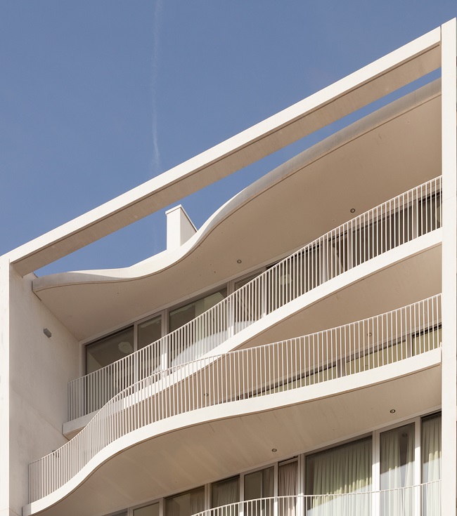 Door de balkons op een aantal plekken naar binnen te vouwen zijn dubbelhoge ruimtes ontstaan. Dit zorgt voor volop zon- en daglicht tot diep in de woningen. De beweging van de balkons wordt in het donker extra geaccentueerd door de geïntegreerde LED-strips en door het optisch effect van open en gesloten delen in het meebewegend hekwerk. In de vloeren van de balkons aan de voorzijde loopt een eveneens in het beton geïntegreerde, langgerekte plantenbak met de kromming mee.