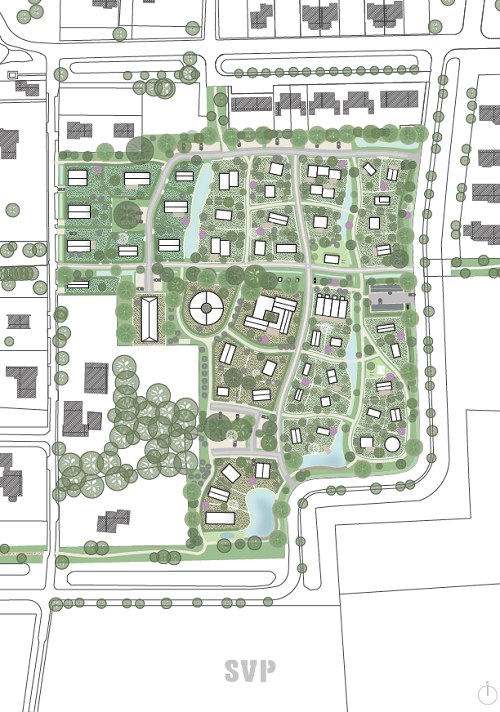 “We hebben hen”, aldus Stoffer, “al vrij snel gepositioneerd in het midden van het plan, aan de hoofdas. Zo werd het plan luchtiger en kleinschaliger. Aan de rand van de wijk zouden hun plannen een te grote impact hebben op de kleinschaligheid en uitstraling.”