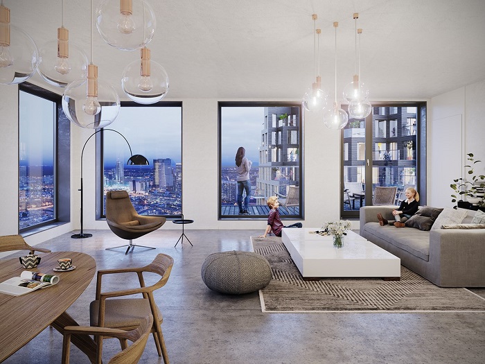 Het midden van elke toren heeft een kwalitatieve, natuurstenen gevel met grote ramen, om de bewoners optimaal zicht op de stad te geven. De kleur van het natuursteen verschuift over de onderste lagen gradueel van een frisse beige tint naar donkerdere, antraciete tint, waardoor de woontorens op straatniveau een 'zachte landing' maken. Deze zachte landing vormt als het ware de basis van de torens.