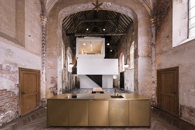 Geconfronteerd met deze dubbele uitdaging, dokterde architect Gregory Nijs (zaakvoerder Klaarchitectuur) een aparte oplossing uit: “We respecteren de schil van dit historische gebouw, maar voegen er een architecturale beleving aan toe,” aldus Nijs. “In het midden installeerden we een hagelwit kubuscomplex , dat je volledig kan demonteren. Zo hoef je enkel de kantoorruimte zelf intensief te verwarmen en moet je niet het volledige gebouw isoleren. Bovendien behoud je de grandeur van het gebouw . De voormalige kapel is ingekleed met onder andere een nieuw altaar, een tabernakel in kruisvorm en een Mariabeeld, als knipoog naar het verleden .”