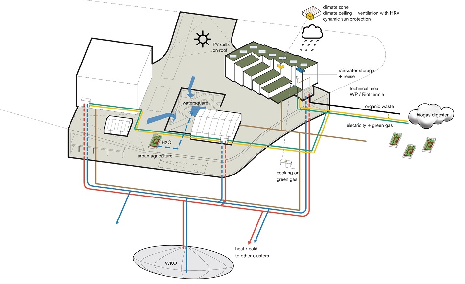 De zuidzijde van het gebouw is een terraslandschap, terwijl de andere zijde een grote open ruimte biedt voor het innovatiecentrum. De gangzone voor de woningen hoog in het gebouw heeft een sterke relatie met buiten en zicht op de Amsterdamse weg. Deze zone is rustig voor mensen die beginnen aan hun revalidatie. De woningen laag in gebouw zijn sterker verbonden aan het centrum. Deze bewoners participeren actief in de verbeteringen van de zorg. De architectuur is hiermee drager van het zorgproces in het gebouw.