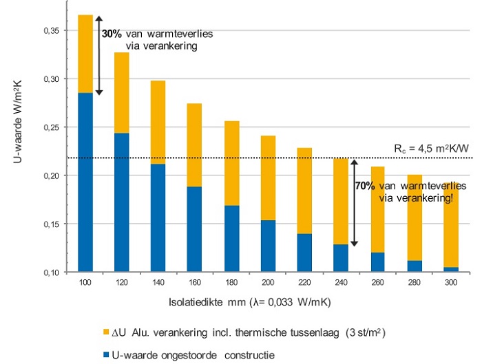 “Omdat de eisen die aan de gevel worden gesteld steeds strenger worden, neemt met de huidige oplossingen de isolatiedikte steeds verder toe,” aldus Westra. “Hierdoor neemt het aandeel van het warmteverlies door de verankeringen ook steeds verder toe. De traditionele verankeringen zijn als thermische lekken in de isolatie. Op basis van de huidige eisen leidt dit, afhankelijk van de gekozen verankeringsoplossingen, al gauw tot 20 procent extra isolatiedikte en kan zelfs oplopen tot een verdubbeling van de benodigde dikte. Met de toename van de isolatie-eisen de komende jaren is de tijd gekomen om de impact die verankeringen hebben op de isolatiewaarde niet langer te negeren. Figuur 1 geeft duidelijk weer wat het aandeel van de verankering in het warmteverlies is bij toename van de isolatiedikte.”