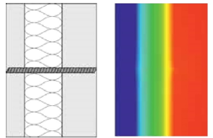 Figuur 2. Grafische weergave van het temperatuursverloop in een prefab betonnen sandwichwand met thermoanker.