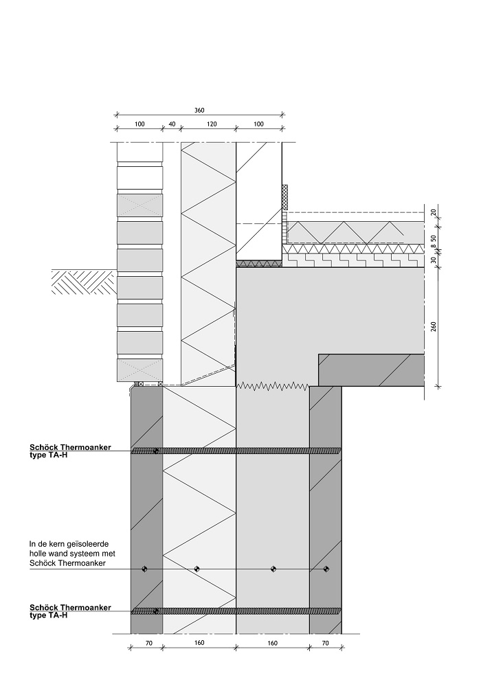 Figuur 4. Detail van een in de kern geïsoleerde holle wand systeem in de kelder.