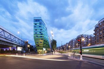 Het kleurrijke hotel valt direct op in de omgeving, die zich kenmerkt door goedkope huizen van baksteen, gebouwd ten tijde van de oorlogen. Aan het oosten wordt het pand geflankeerd door een verkeersintensief gebied. De driehoekige locatie van ca. 10.000 m2 wordt bovendien tot op de centimeter door het gebouw ingenomen waardoor het direct aan een 6 meter hoge geluidsbarrière grenst.