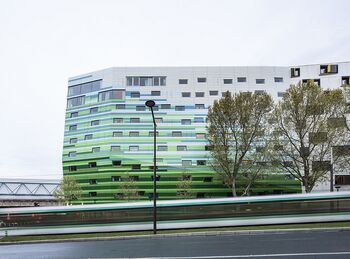 De schuin aflopende gevel is een gevolg van de nauwe bouwlocatie. Hierdoor ontstaat op straatniveau ruimte voor onder meer bouwverkeer, dat door een toegangsweg bij de geluidsbarrière rijdt, en door het bredere volume op hogere verdiepingen blijft er voldoende ruimte voor de hotelkamers. Een handige oplossing door bureau Manuelle Gautrand Architecture om het hotel in de omgeving te passen.