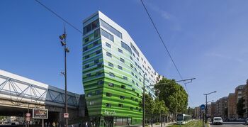 Ondanks deze stedelijke restricties oogt het gebouw niet krap en zelfs fris. Dat valt vooral te danken aan het patroon in de groene en blauwe kleuren van de gevel, die op de hoogste verdiepingen als een wolk in de lucht lijkt op te gaan. Door het smalle, ietwat gebogen volume richt het hotel zich als een boeg op het Philharmonie de Paris van Jean Nouvel.